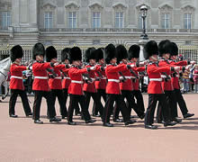 red tunics and black bearskin hats, marching to the front of the palace